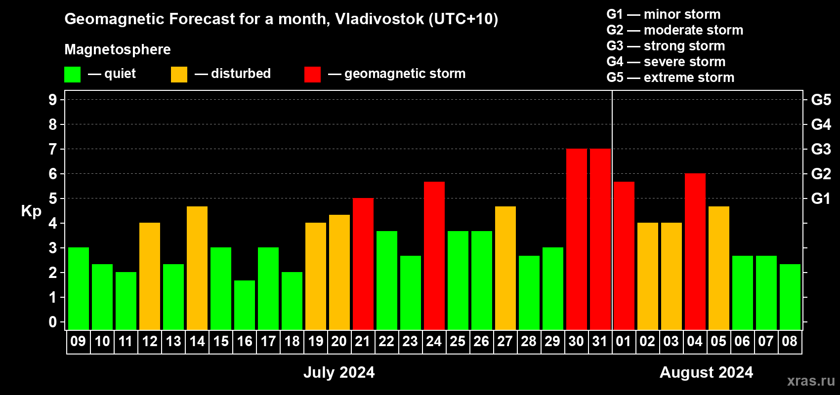 Geomagnetic activity forecast in Vladivostok — Jul 09, 2024