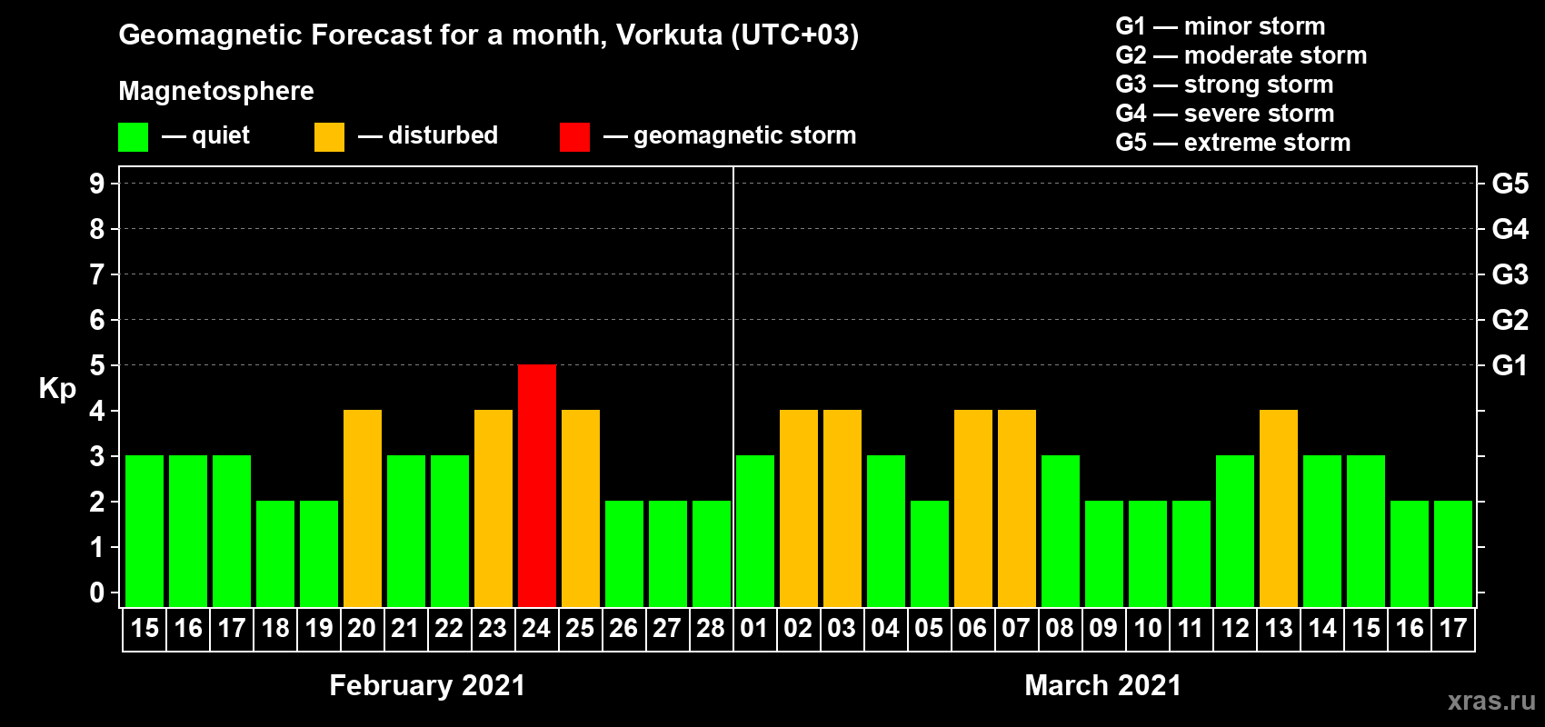 Geomagnetic storm forecast in Vorkuta for Feb 15, 2021