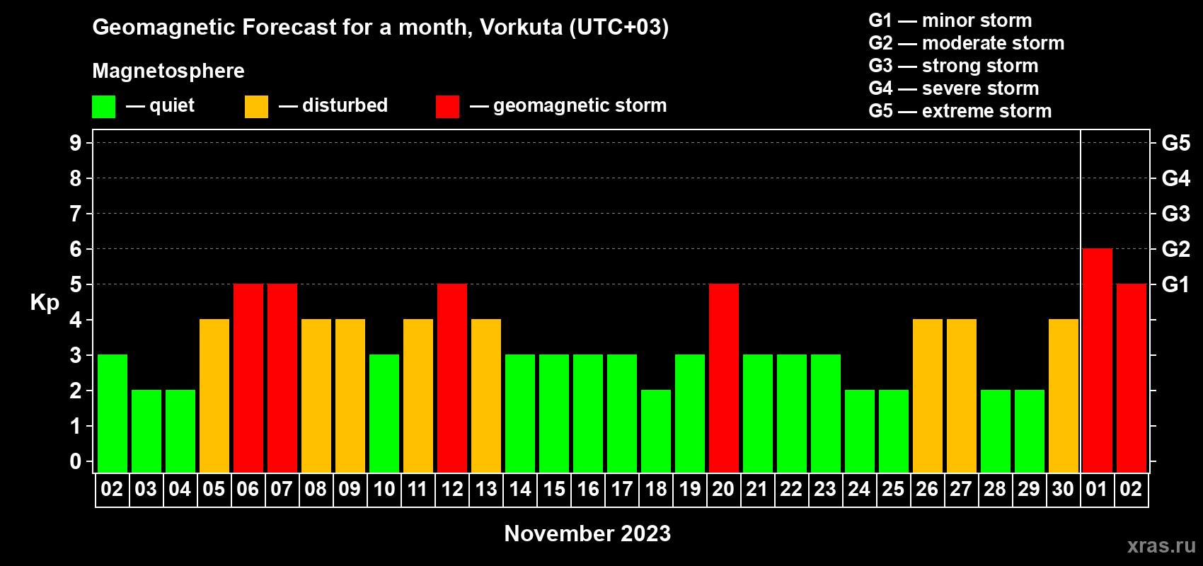 Geomagnetic storm forecast in Vorkuta for Nov 02, 2023