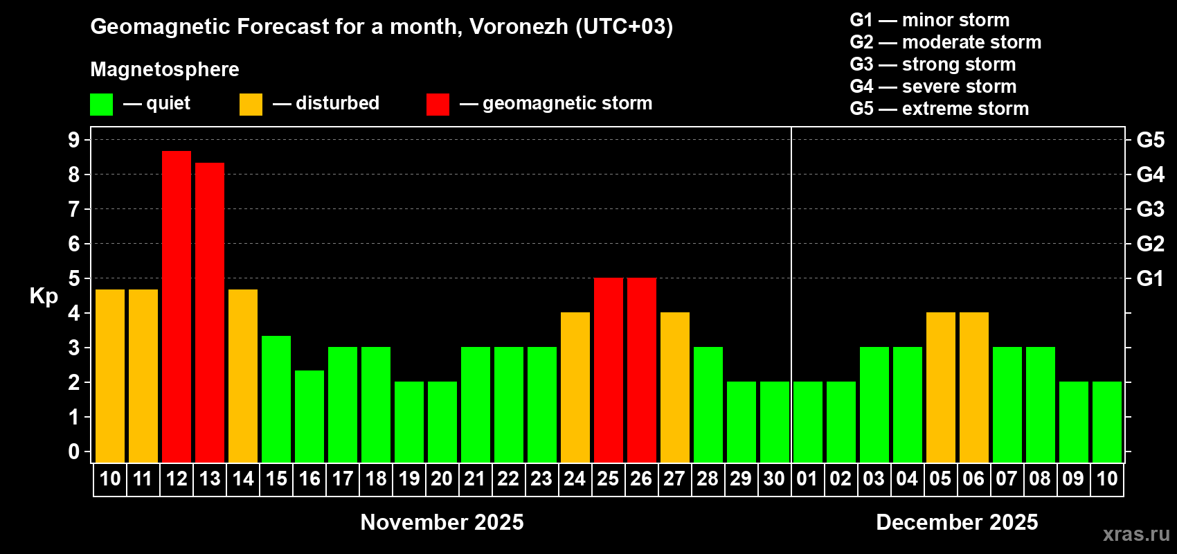 Geomagnetic storm forecast in Voronezh for Nov 10, 2025