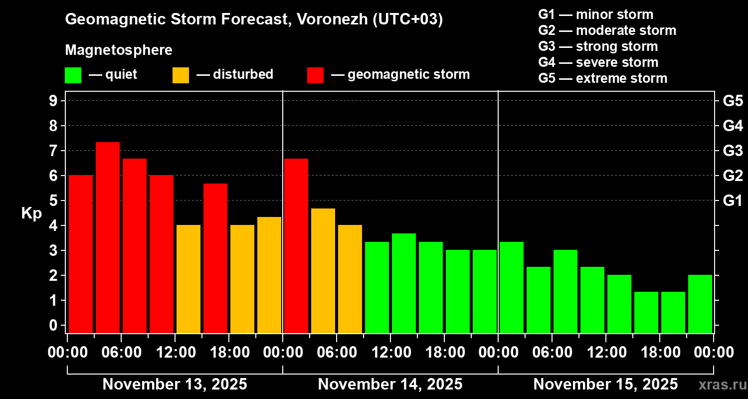 Geomagnetic storm forecast in Voronezh for Nov 13, 2025