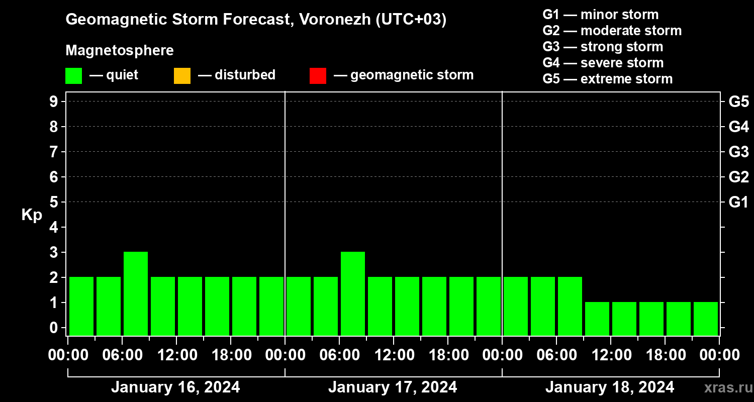 Geomagnetic storm forecast in Voronezh for Jan 16, 2024
