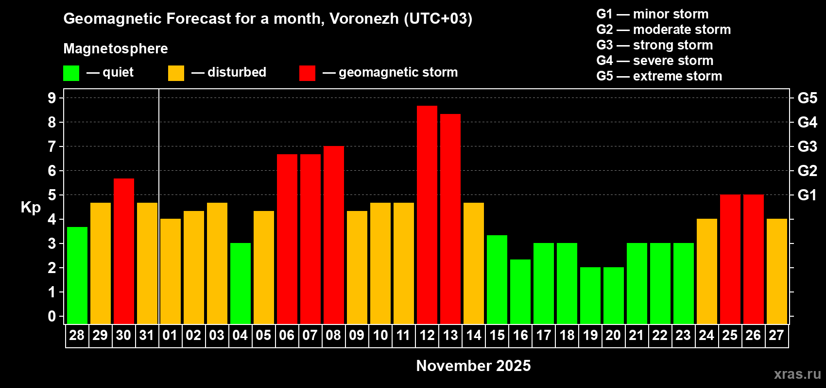 Geomagnetic storm forecast in Voronezh for Oct 28, 2025