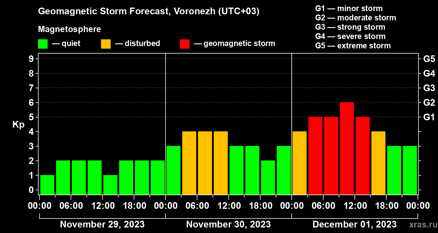 Geomagnetic storm forecast in Voronezh for Nov 29, 2023
