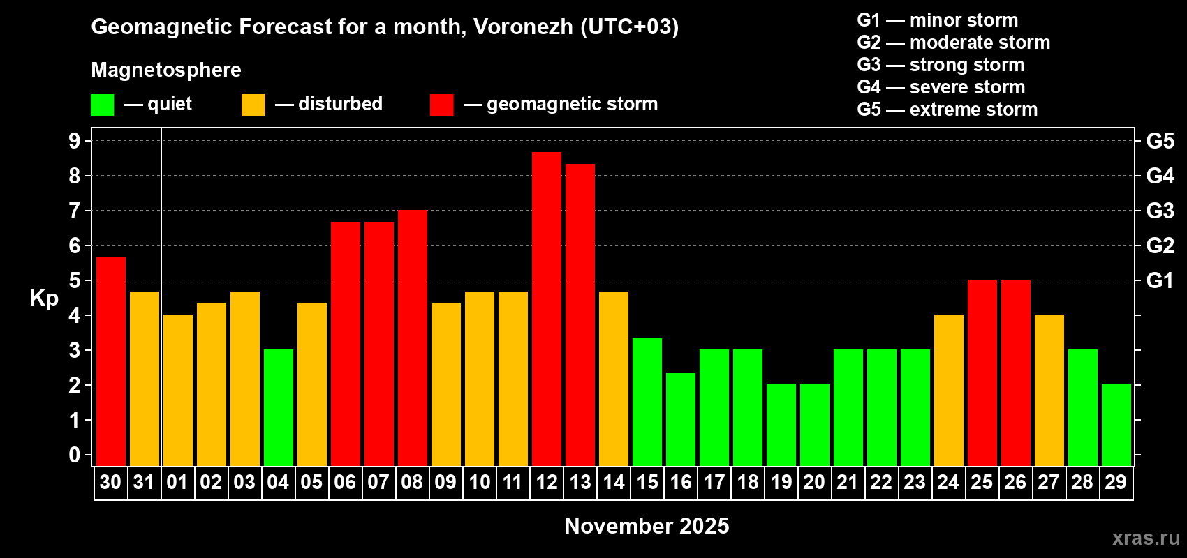 Geomagnetic storm forecast in Voronezh for Oct 30, 2025