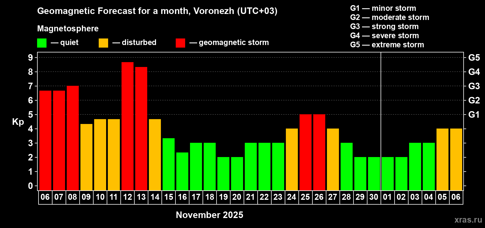 Geomagnetic storm forecast in Voronezh for Nov 06, 2025