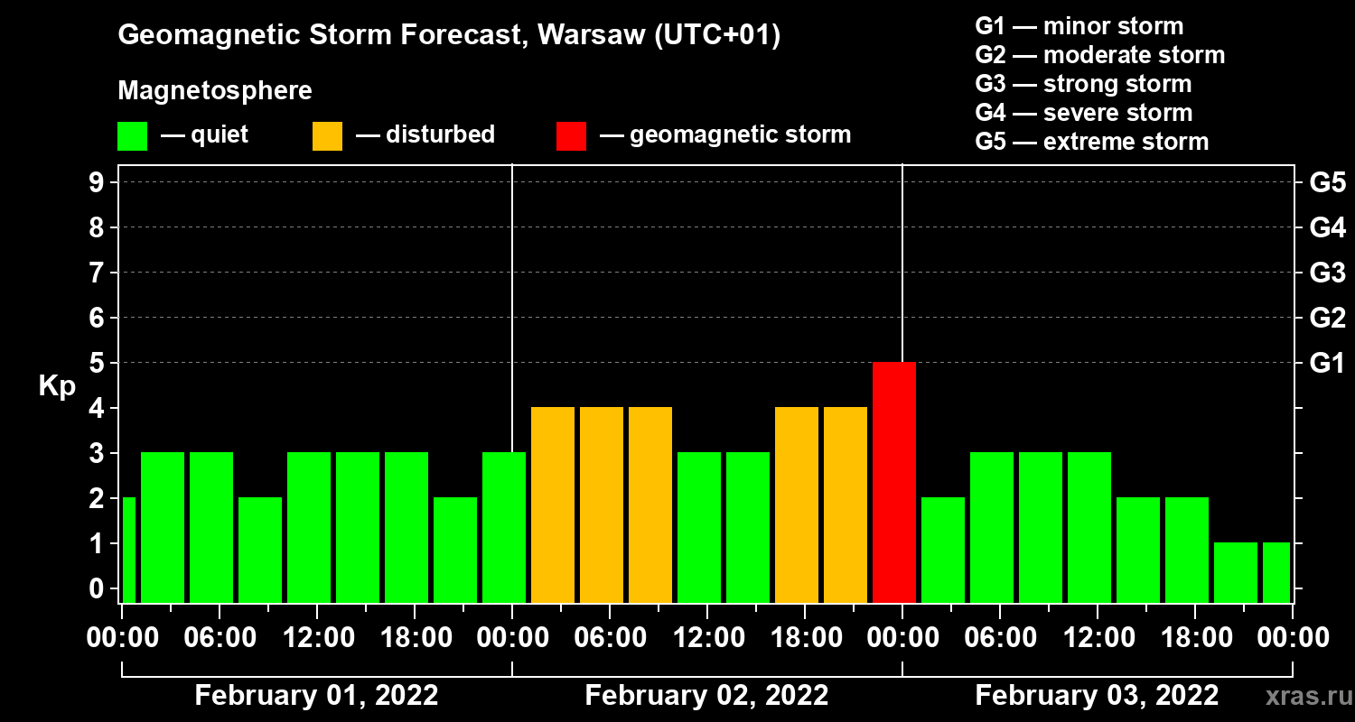 Geomagnetic storm forecast in Warsaw for Feb 01, 2022