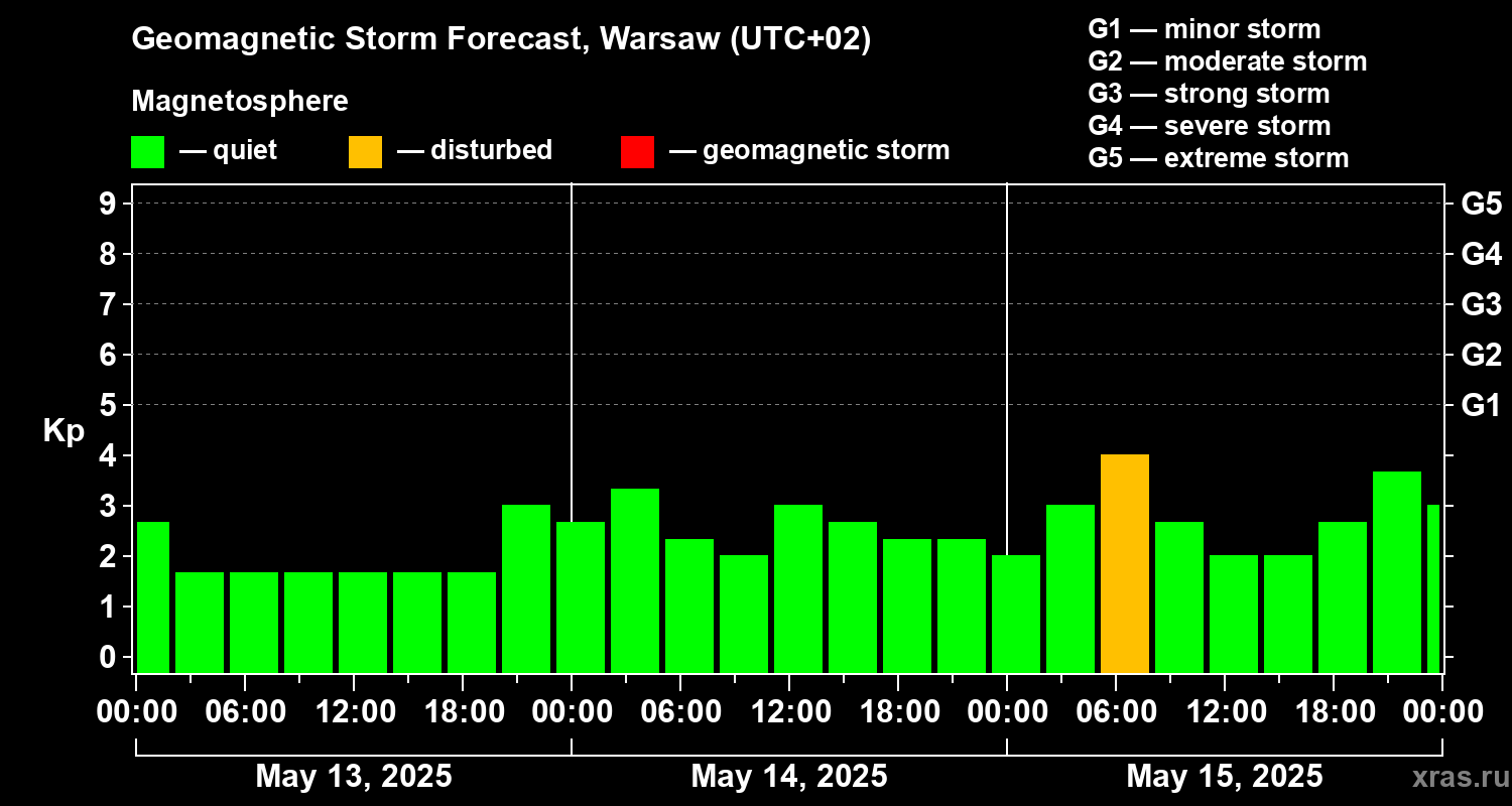 Geomagnetic storm forecast in Warsaw for May 13, 2025
