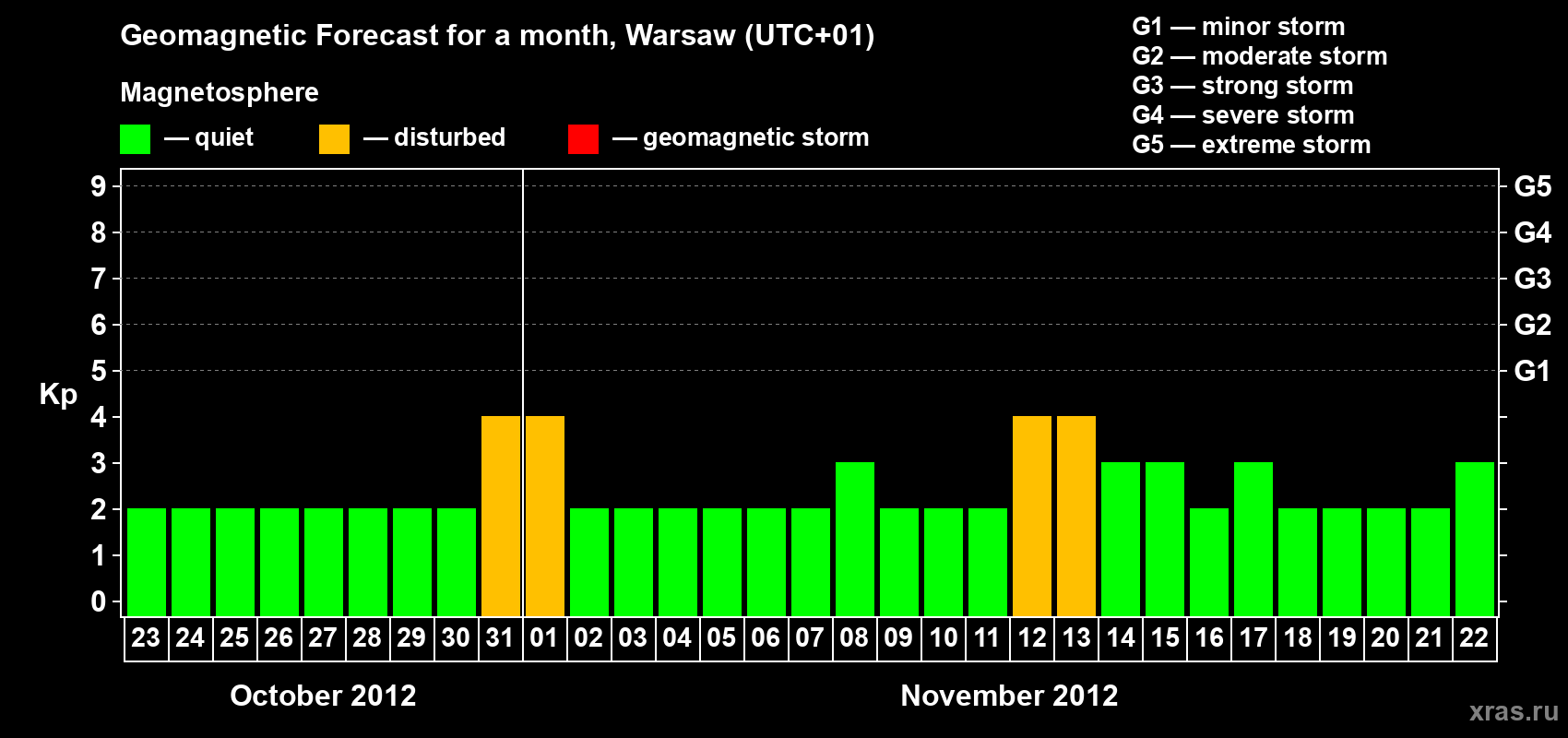 Geomagnetic storm forecast in Warsaw for Oct 23, 2012