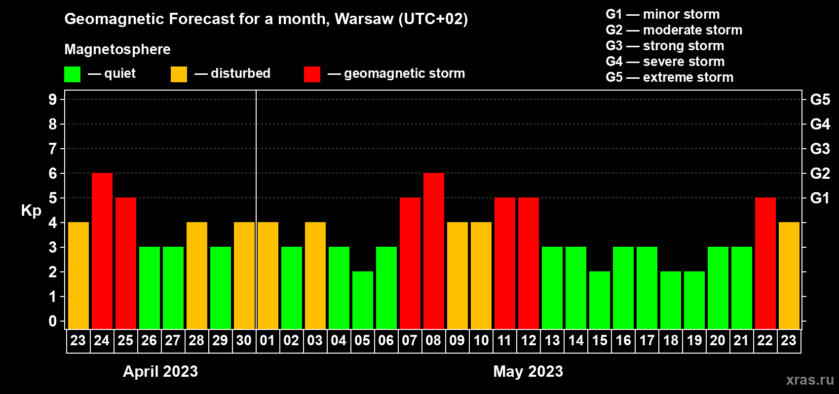 Geomagnetic storm forecast in Warsaw for Apr 23, 2023