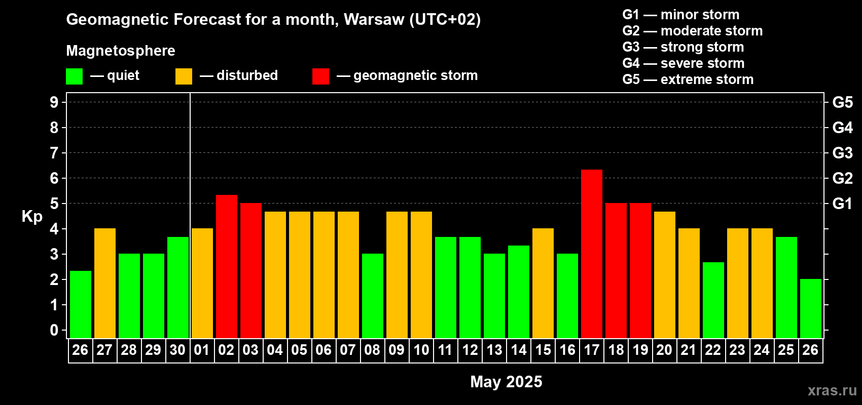 Geomagnetic storm forecast in Warsaw for Apr 26, 2025
