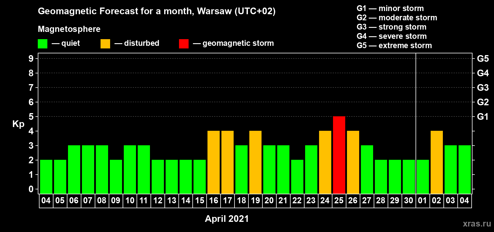 Geomagnetic storm forecast in Warsaw for Apr 04, 2021