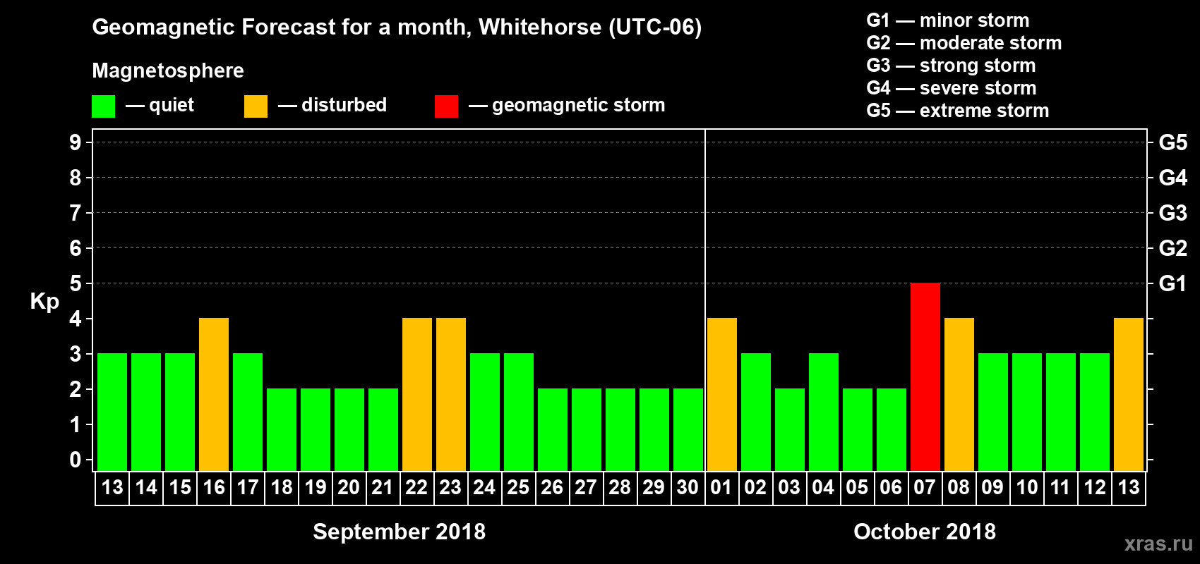 Geomagnetic storm forecast in Whitehorse for Sep 13, 2018