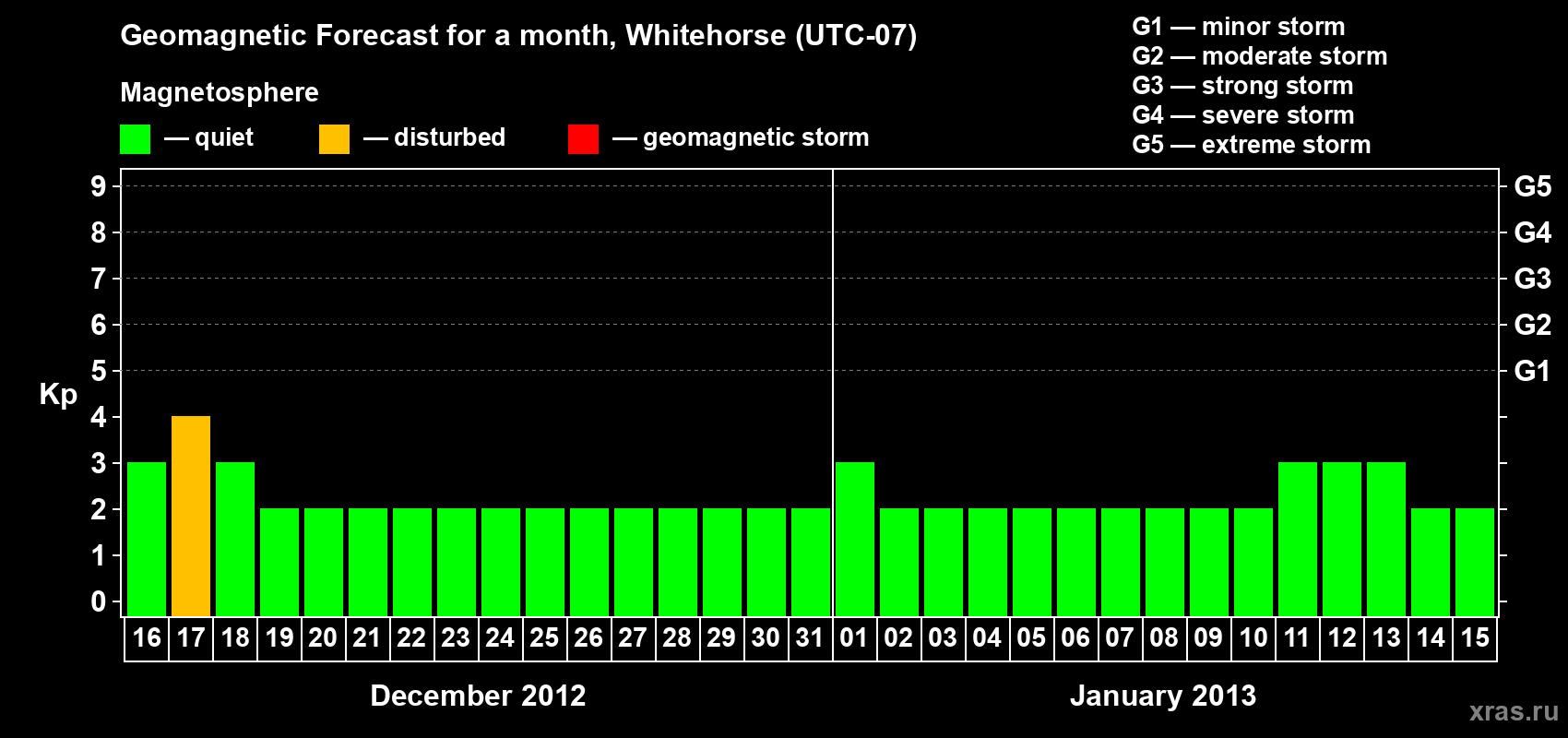 Geomagnetic storm forecast in Whitehorse for Dec 16, 2012