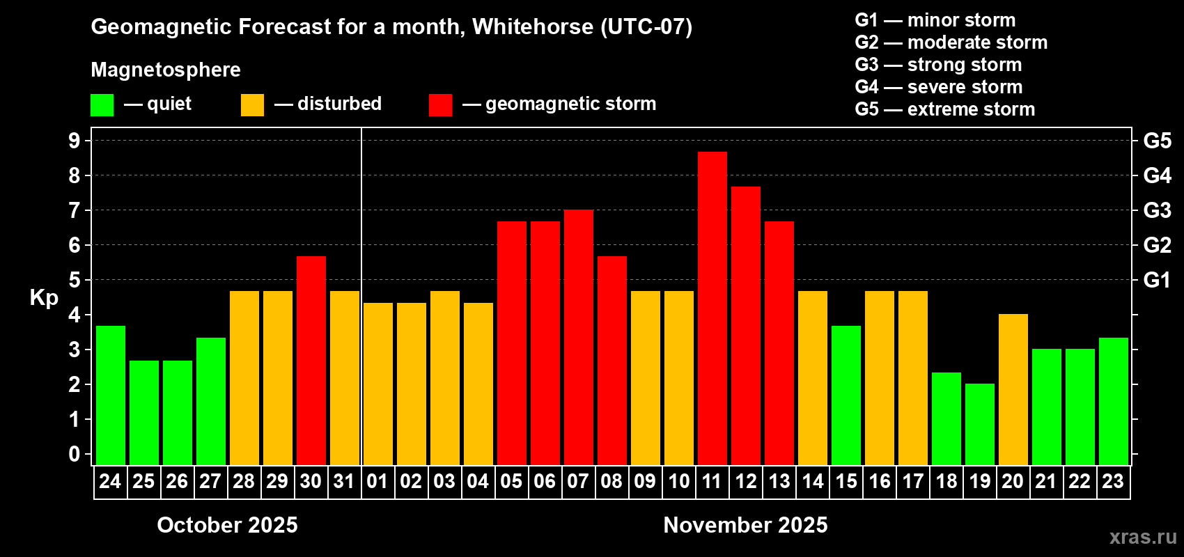 Geomagnetic storm forecast in Whitehorse for Oct 24, 2025