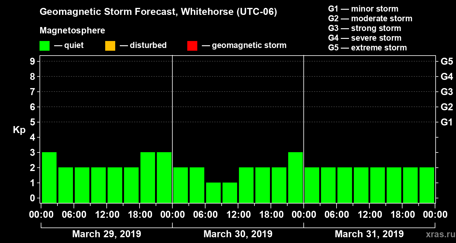 Geomagnetic storm forecast in Whitehorse for Mar 29, 2019