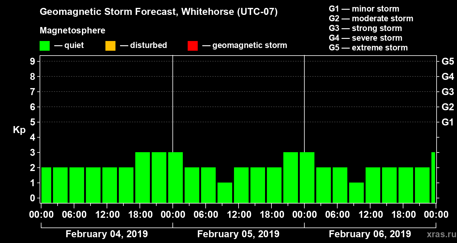Geomagnetic storm forecast in Whitehorse for Feb 04, 2019