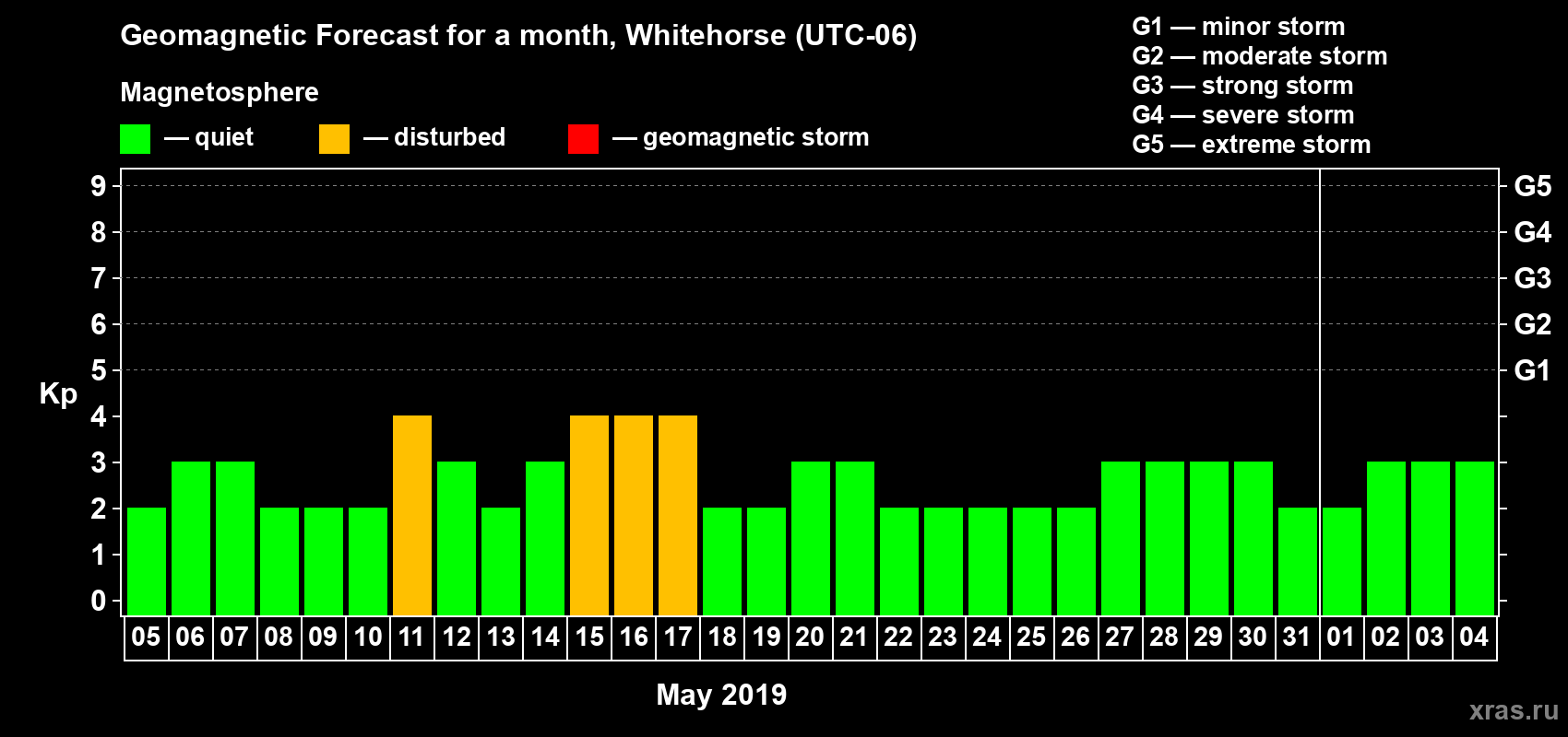 Geomagnetic storm forecast in Whitehorse for May 05, 2019