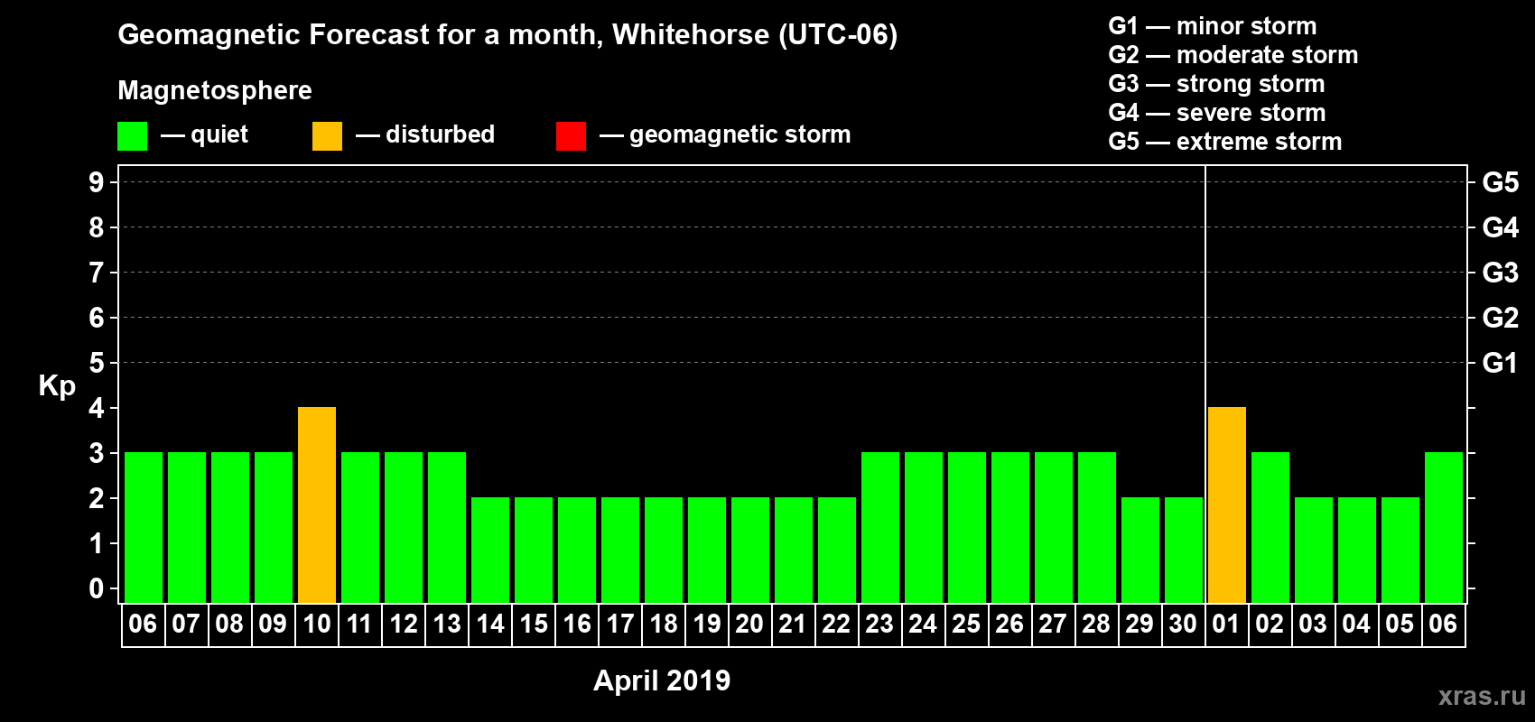 Geomagnetic storm forecast in Whitehorse for Apr 06, 2019