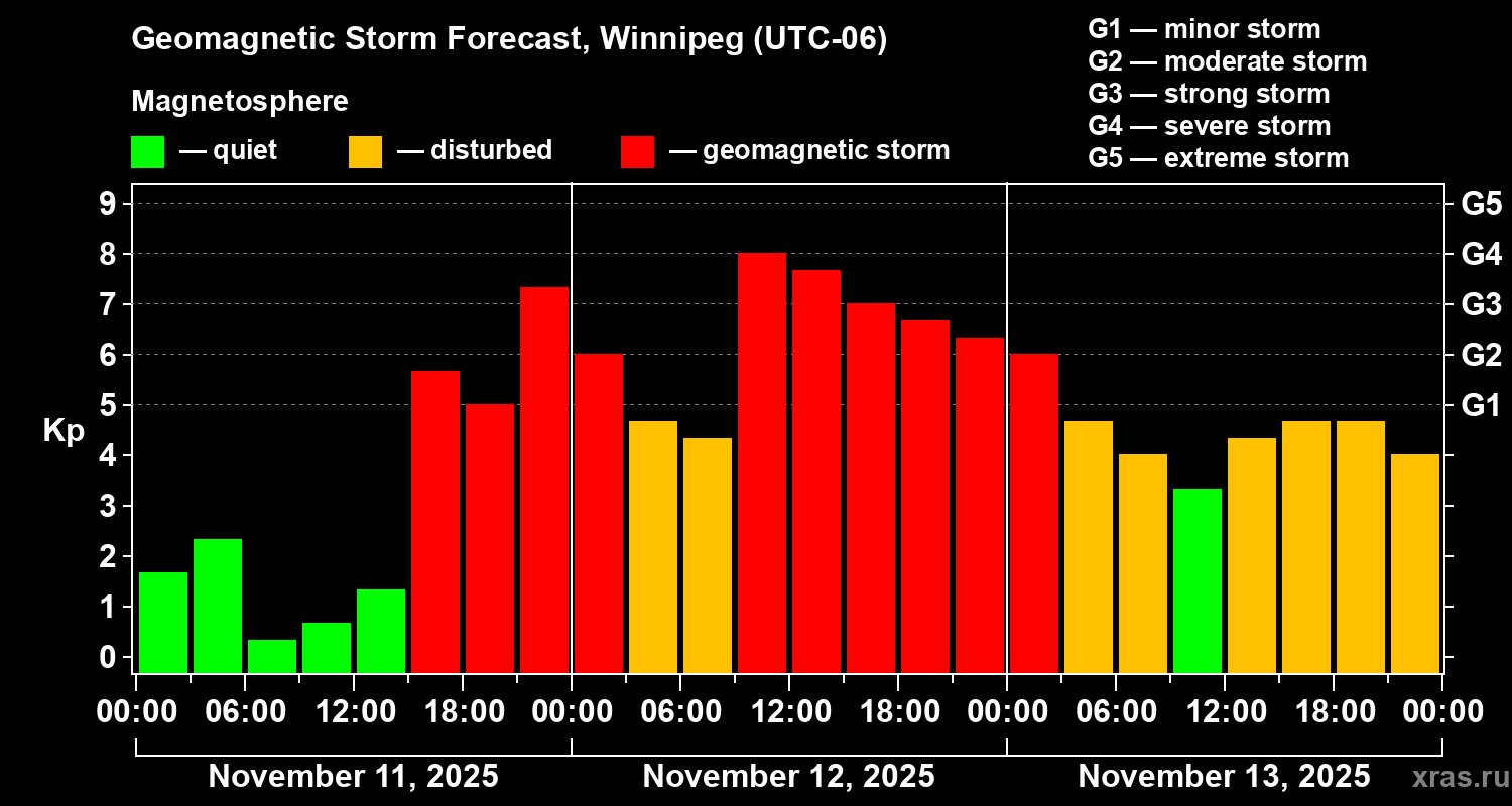 Geomagnetic storm forecast in Winnipeg for Nov 11, 2025