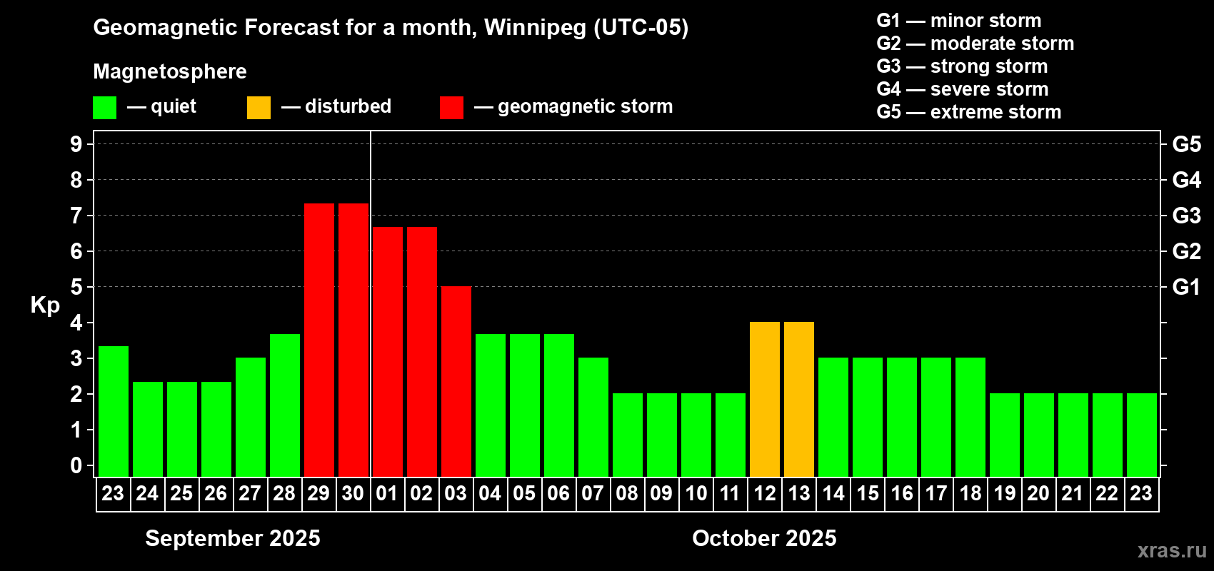 Geomagnetic storm forecast in Winnipeg for Sep 23, 2025