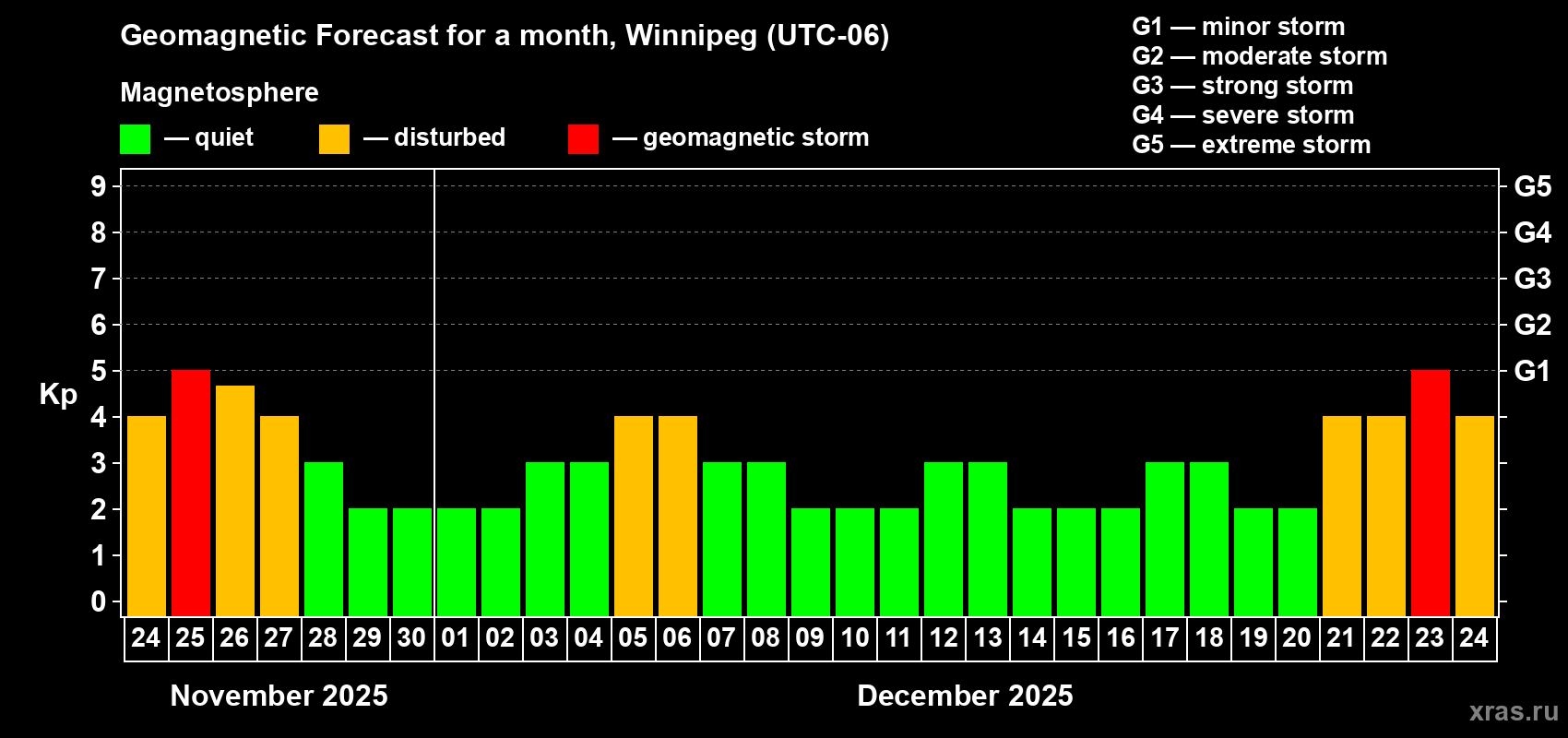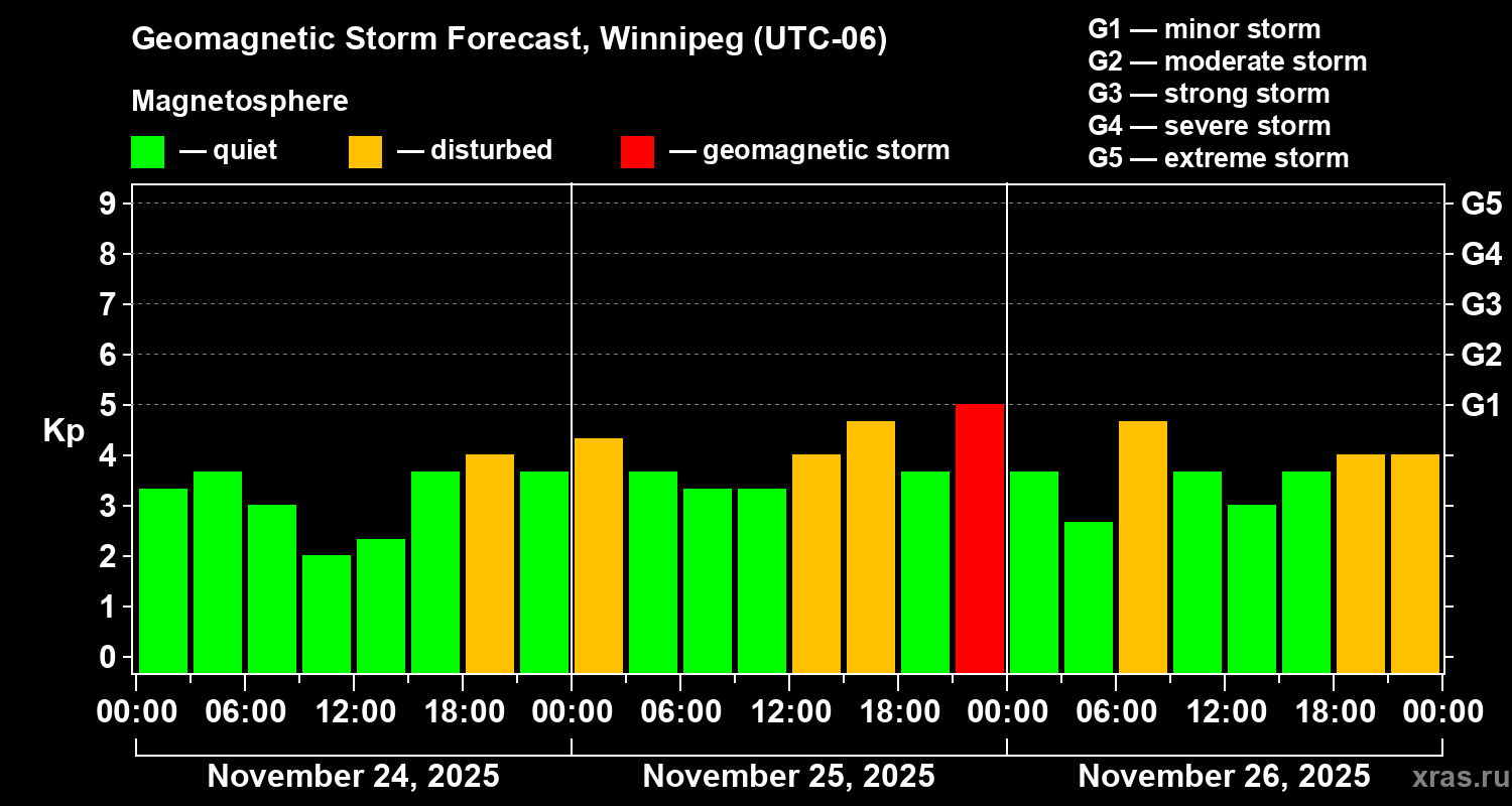 Geomagnetic storm forecast in Winnipeg for Nov 24, 2025