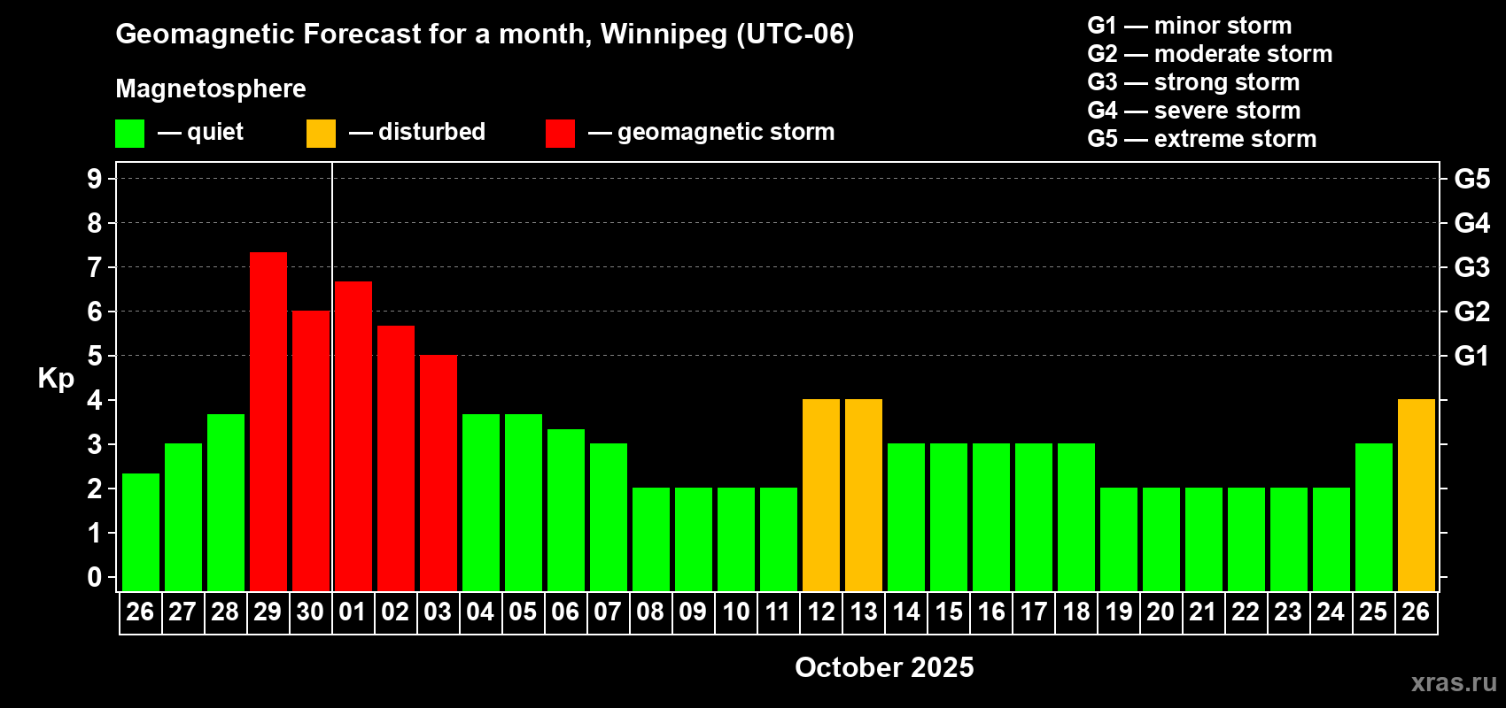 Geomagnetic storm forecast in Winnipeg for Sep 26, 2025