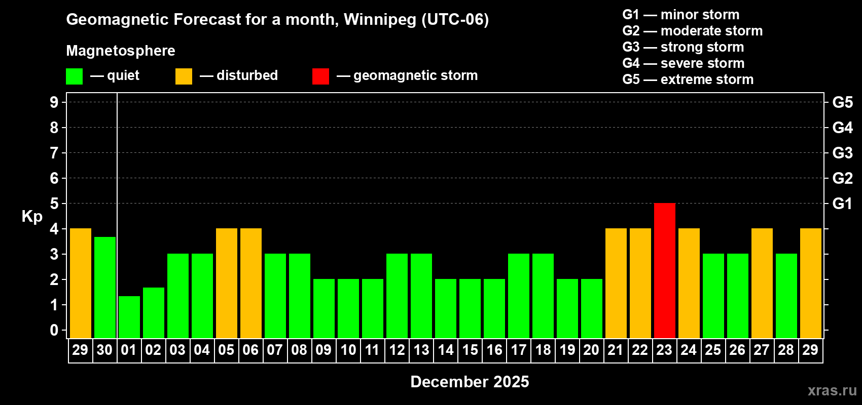 Geomagnetic storm forecast in Winnipeg for Nov 29, 2025