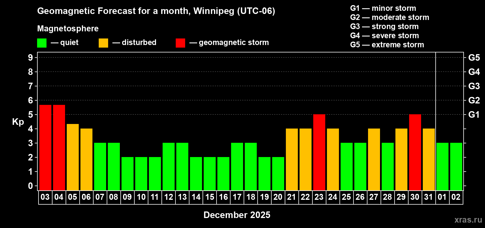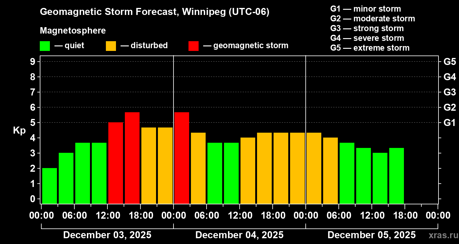 Geomagnetic storm forecast in Winnipeg for Dec 03, 2025