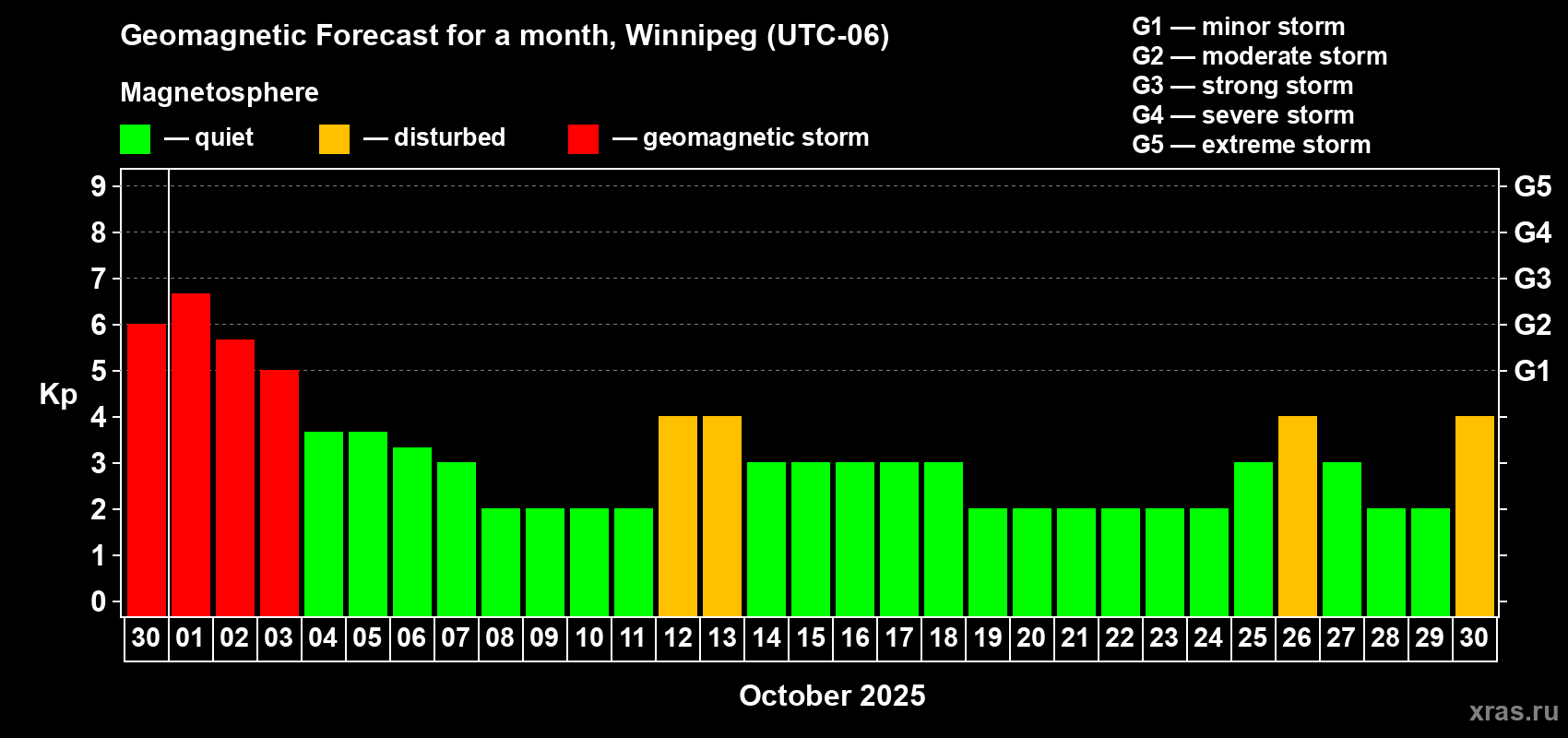 Geomagnetic storm forecast in Winnipeg for Sep 30, 2025