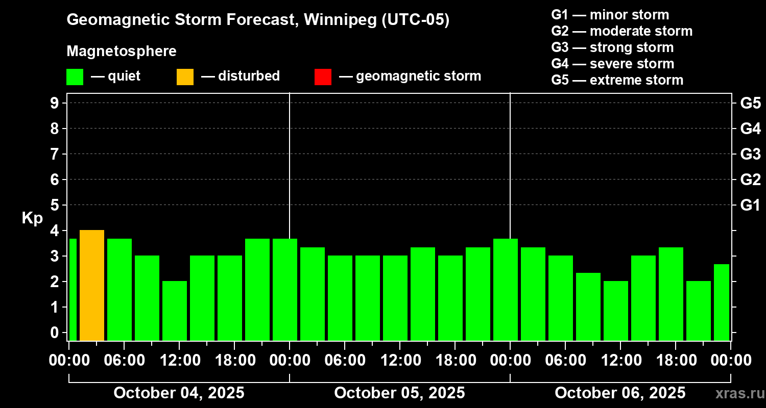 Geomagnetic storm forecast in Winnipeg for Oct 04, 2025