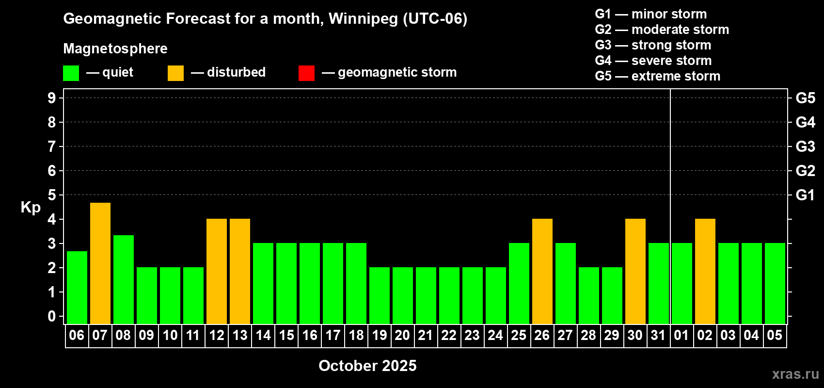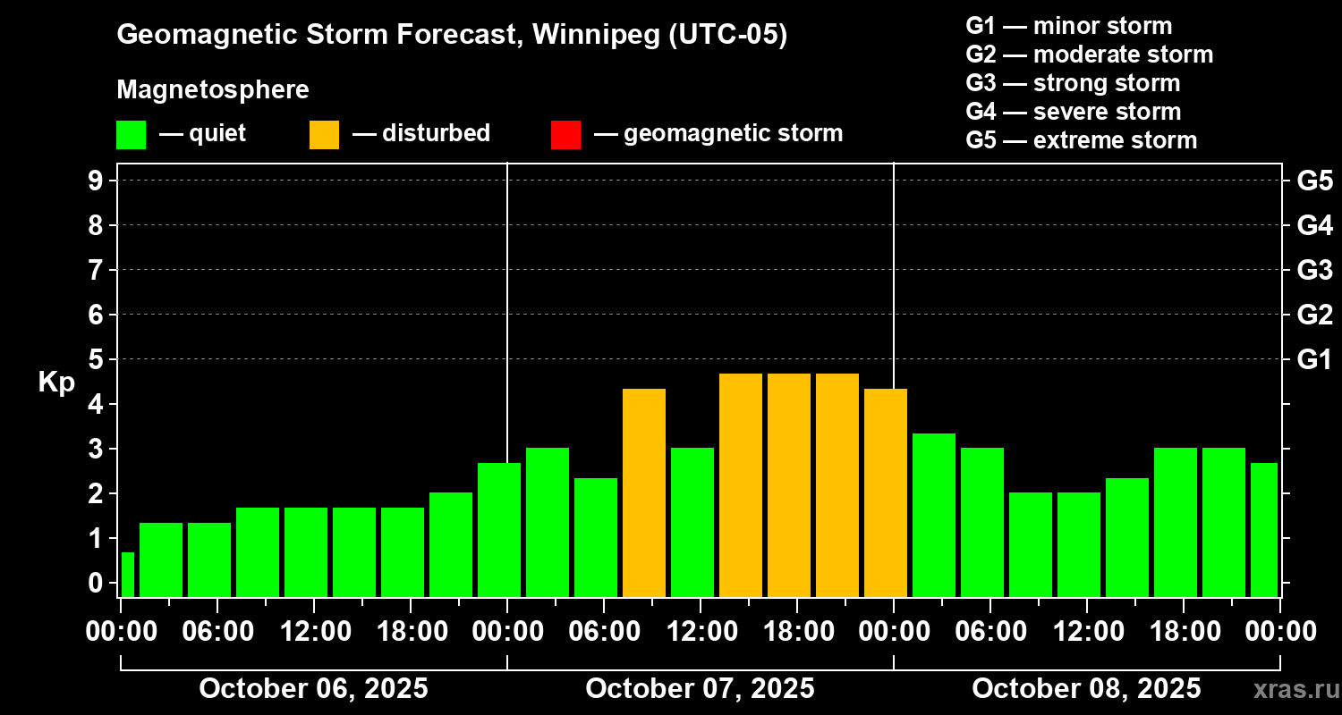 Geomagnetic storm forecast in Winnipeg for Oct 06, 2025
