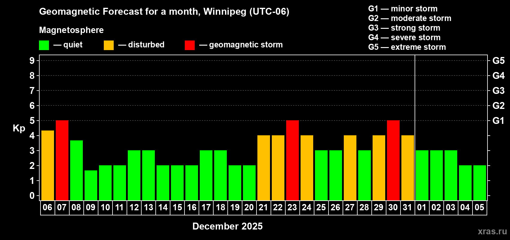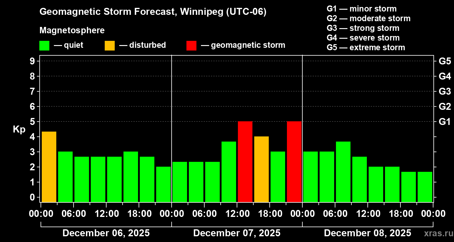 Geomagnetic storm forecast in Winnipeg for Dec 06, 2025