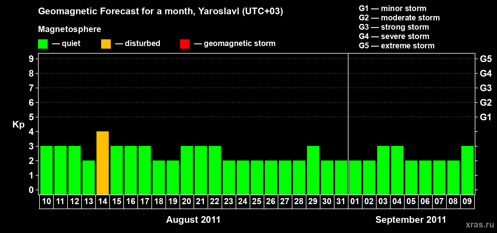 Geomagnetic storm forecast in Yaroslavl for Aug 10, 2011