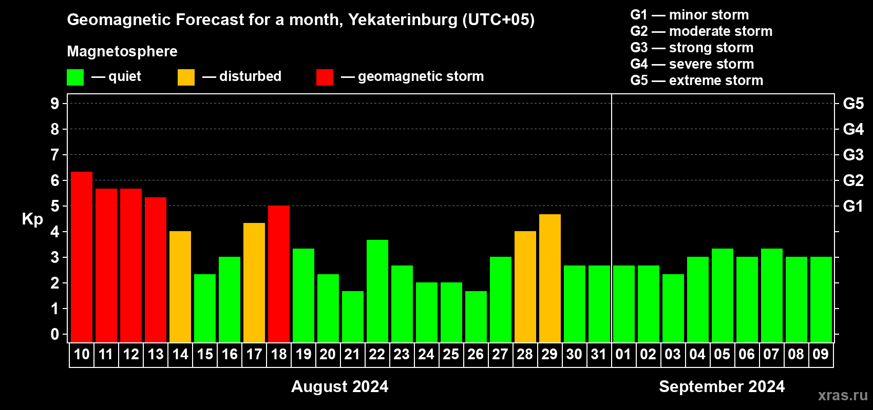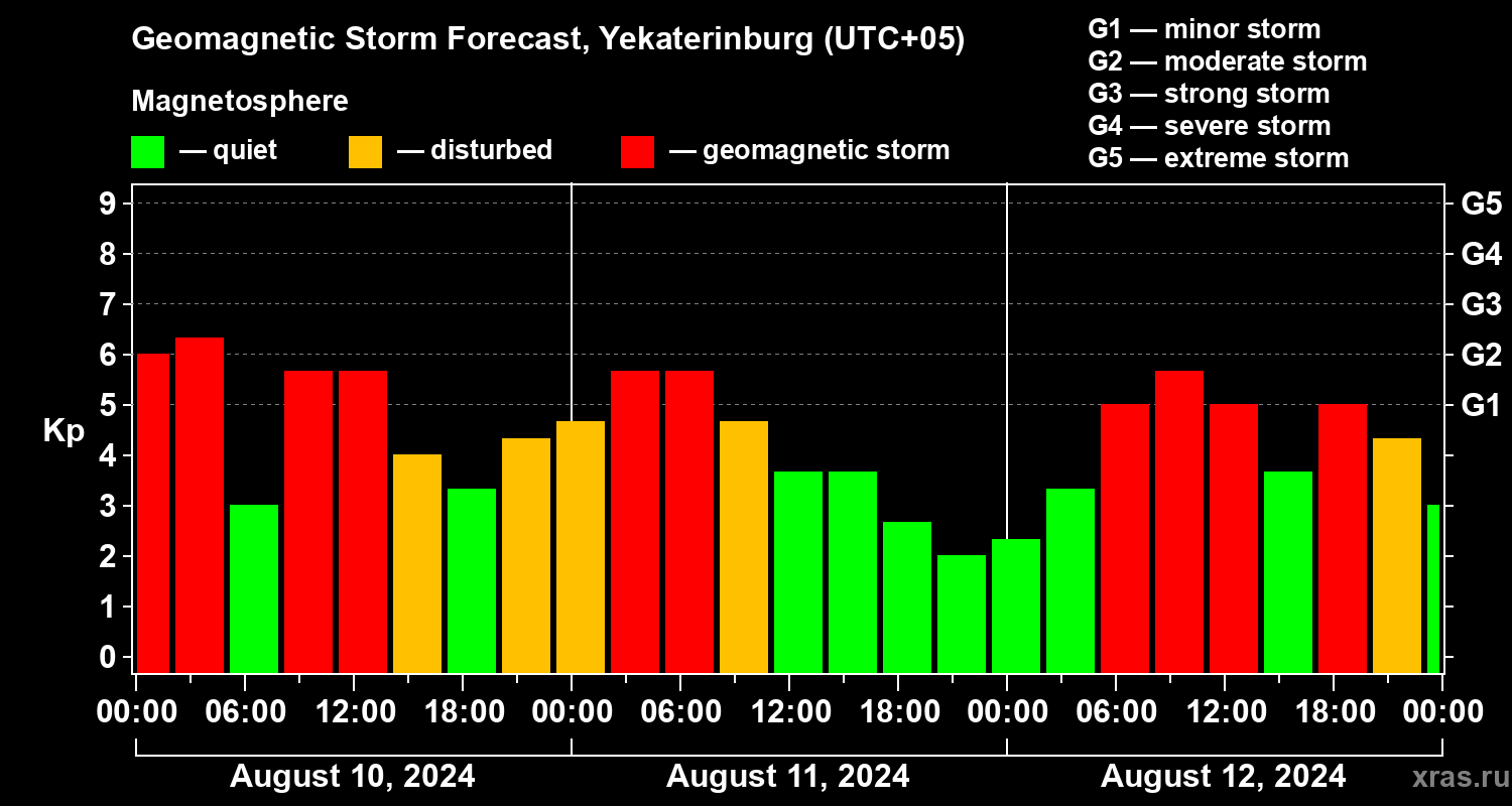 Geomagnetic storm forecast in Yekaterinburg for Aug 10, 2024
