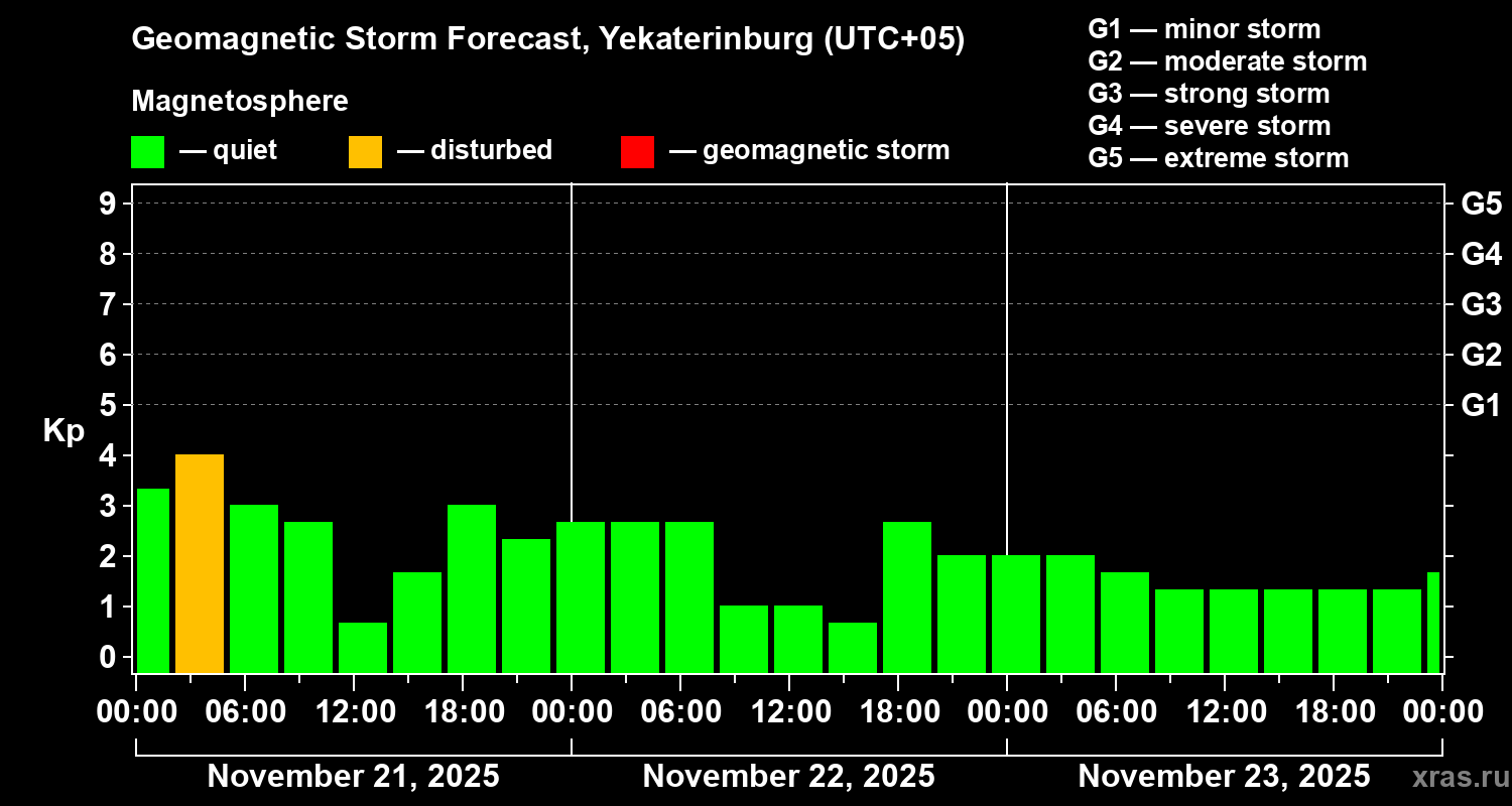 Geomagnetic storm forecast in Yekaterinburg for Nov 21, 2025