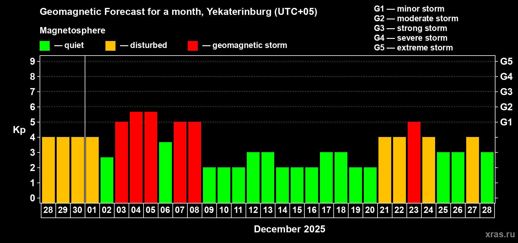 Geomagnetic storm forecast in Yekaterinburg for Nov 28, 2025