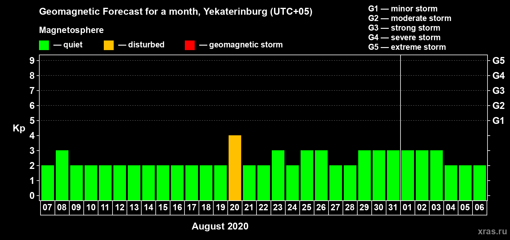 Geomagnetic storm forecast in Yekaterinburg for Aug 07, 2020