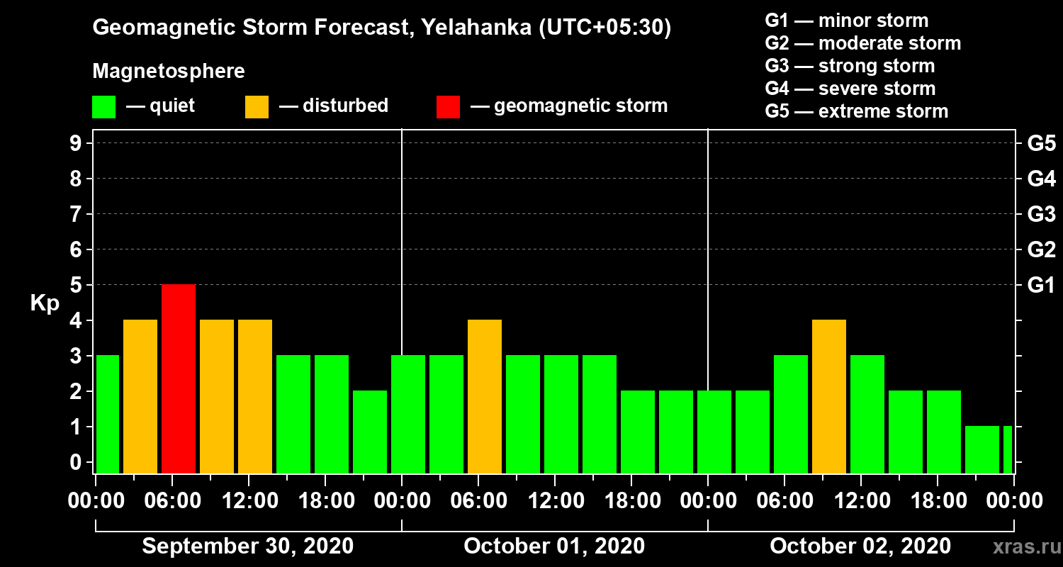 Geomagnetic storm forecast in Yelahanka for Sep 30, 2020
