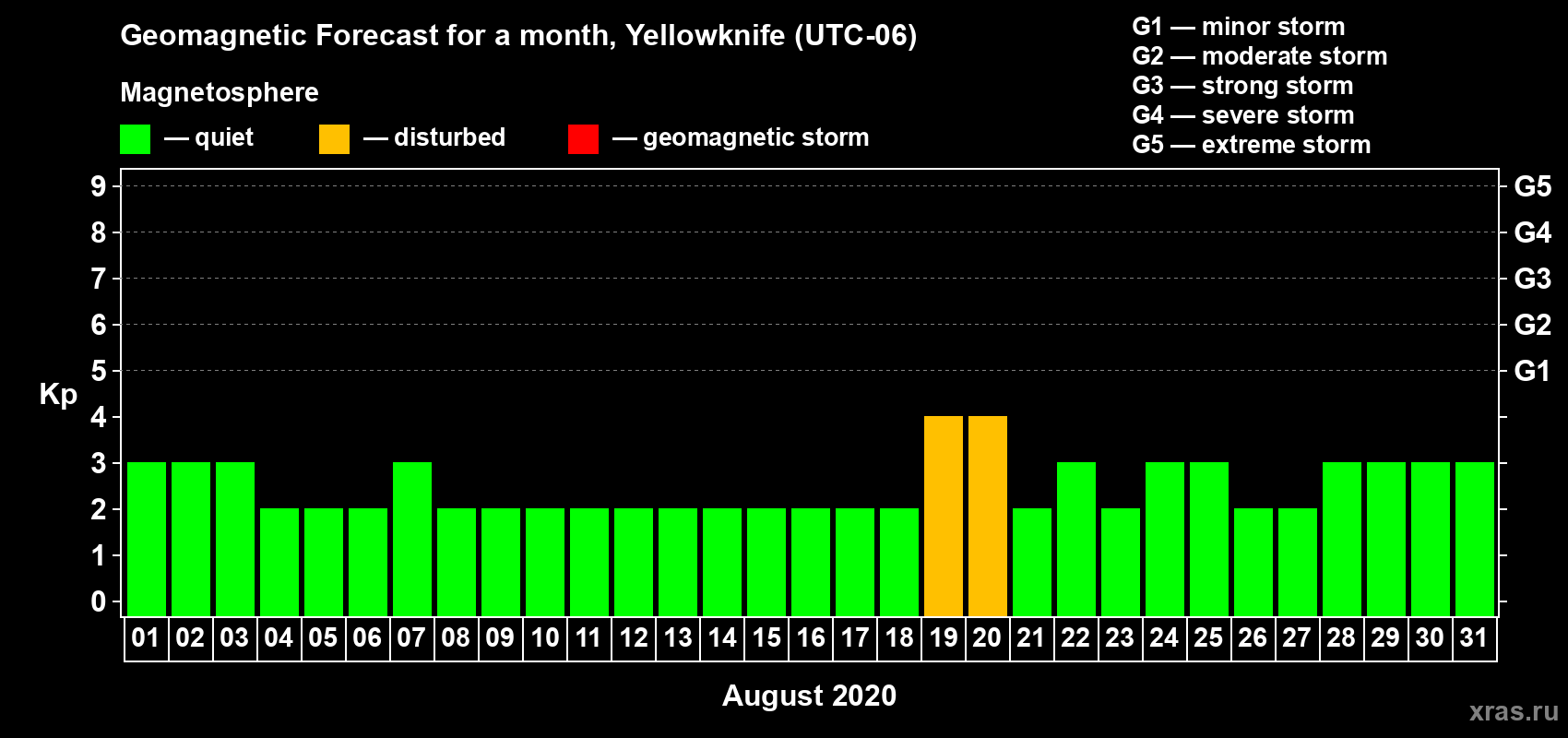 Geomagnetic storm forecast in Yellowknife for Aug 01, 2020