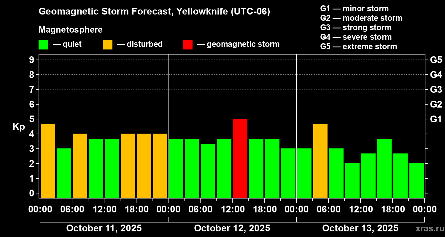 Geomagnetic storm forecast in Yellowknife for Oct 11, 2025