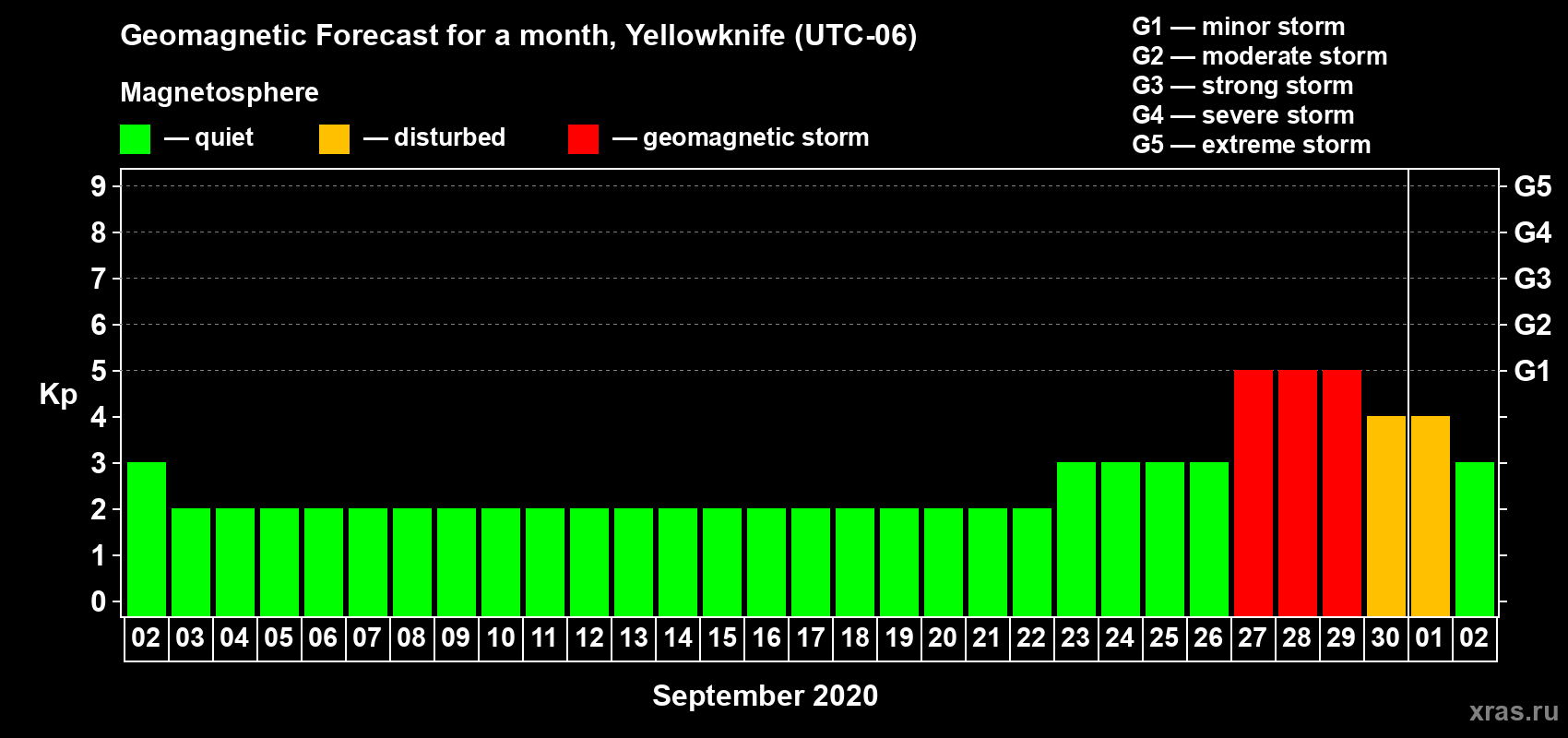 Geomagnetic storm forecast in Yellowknife for Sep 02, 2020