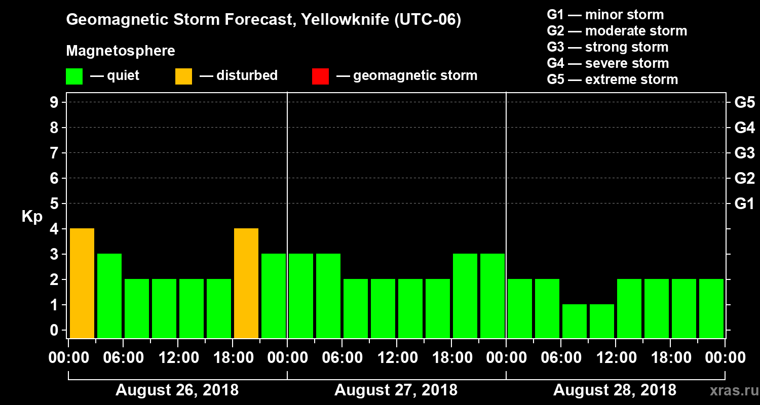 Geomagnetic storm forecast in Yellowknife for Aug 26, 2018
