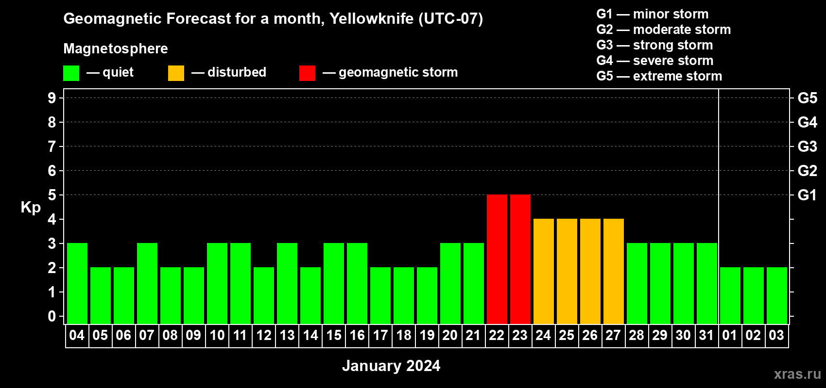 Geomagnetic storm forecast in Yellowknife for Jan 04, 2024