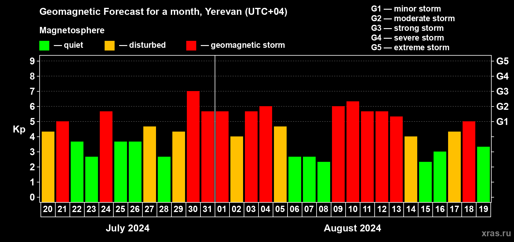 Geomagnetic storm forecast in Yerevan for Jul 20, 2024