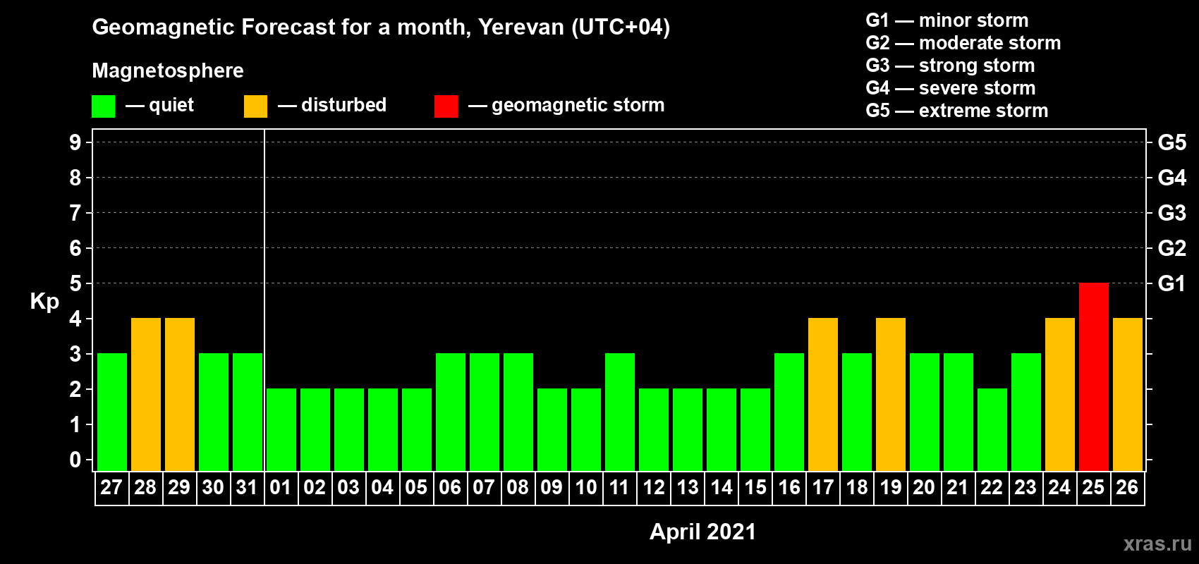 Geomagnetic storm forecast in Yerevan for Mar 27, 2021