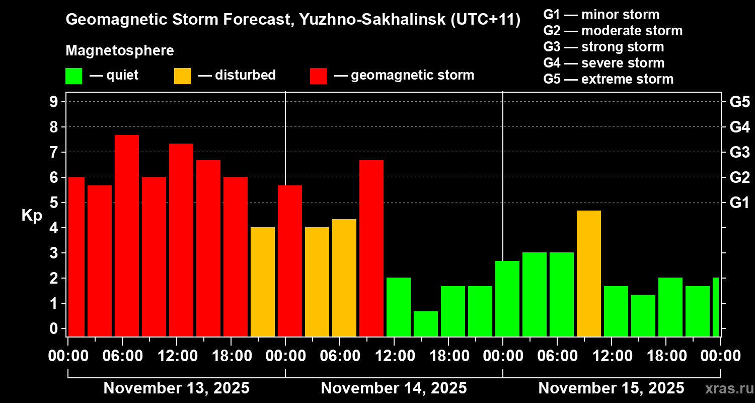 Geomagnetic storm forecast in Yuzhno-Sakhalinsk for Nov 13, 2025