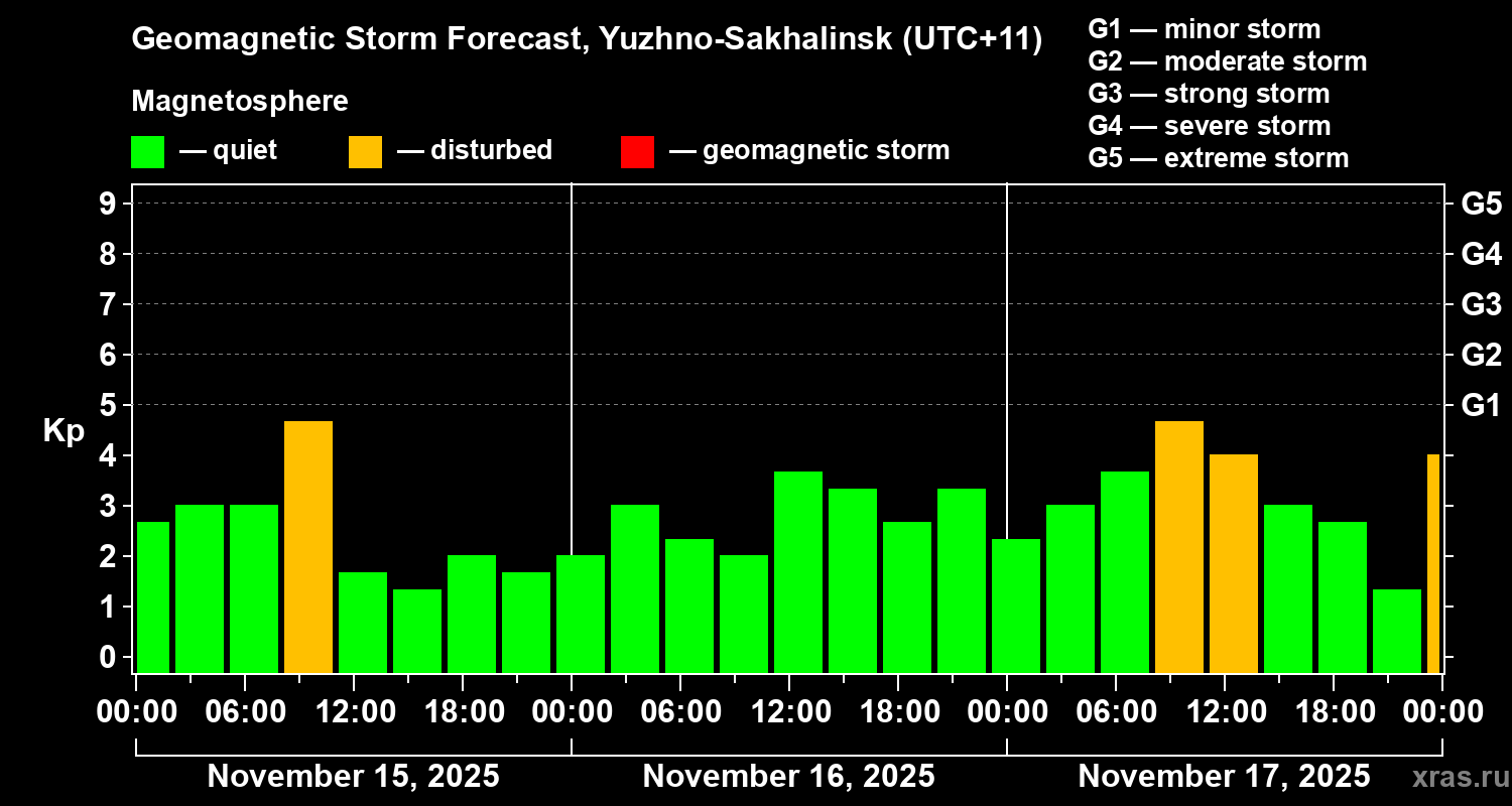 Geomagnetic storm forecast in Yuzhno-Sakhalinsk for Nov 15, 2025