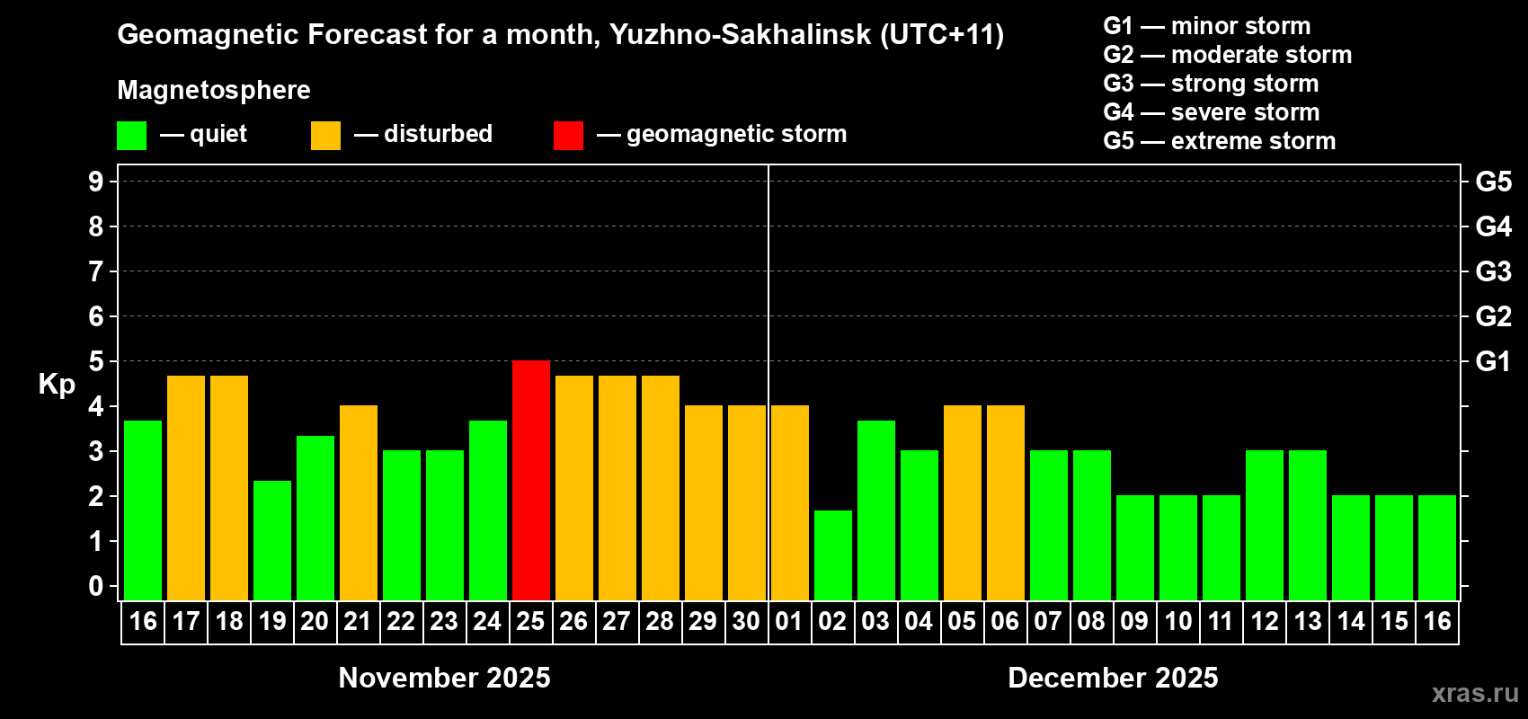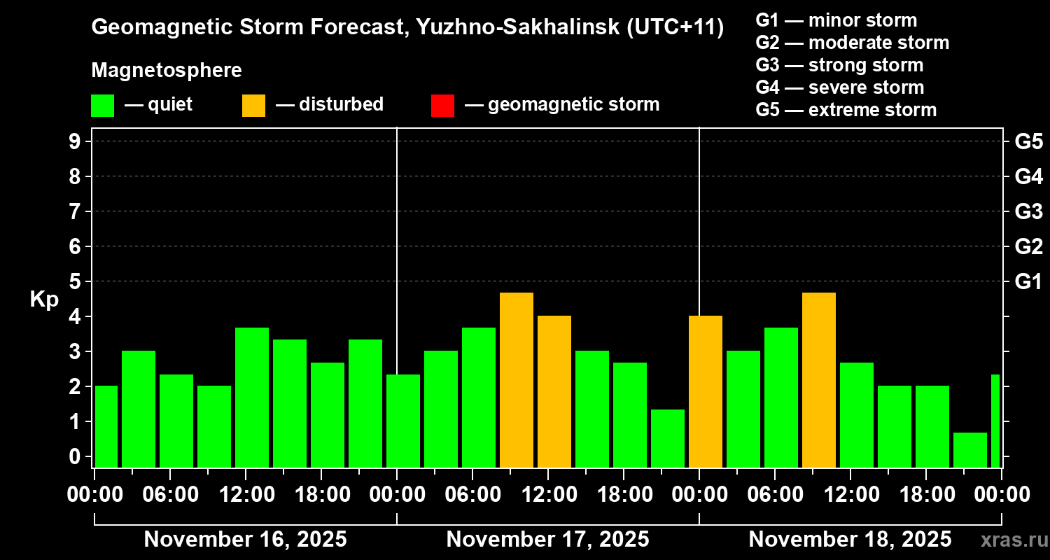 Geomagnetic storm forecast in Yuzhno-Sakhalinsk for Nov 16, 2025