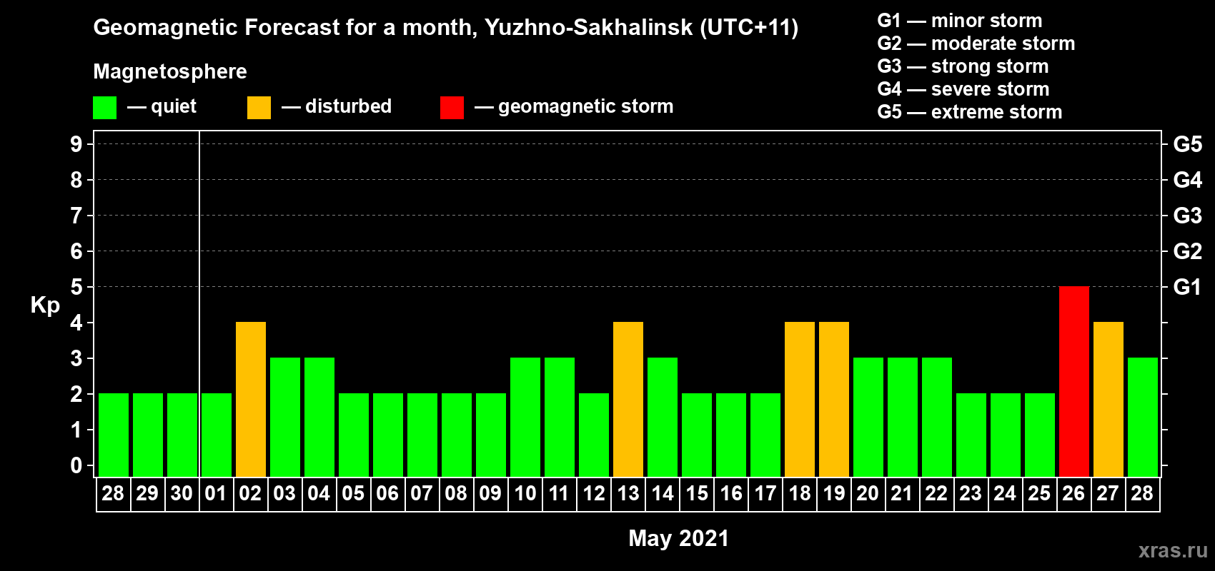 Geomagnetic storm forecast in Yuzhno-Sakhalinsk for Apr 28, 2021